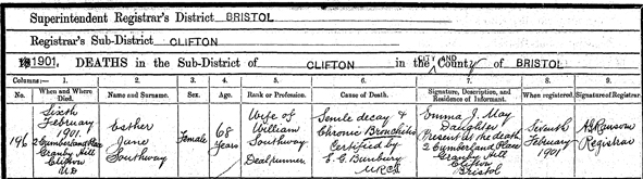 Esther Jane Southway died on 6th February 1901 aged 68 at 2 Cumberland Place, Granby Hill in Clifton. Her daughter, Emma Jemima May, registered her death.
