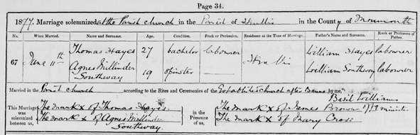 Agnes Melinda Southway was born in 1860. She married Thomas Picket Hayes in 1877 in Hennlys, Monmouthshire.