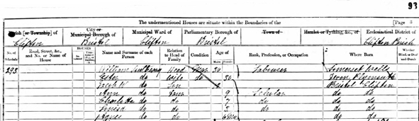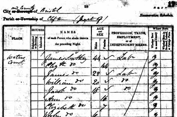 Class: HO107; Piece: 377; Book: 7; Civil Parish: Clifton; County: Gloucestershire; Enumeration District: 12; Folio: 17; Page: 28; Line: 12; GSU roll: 288786