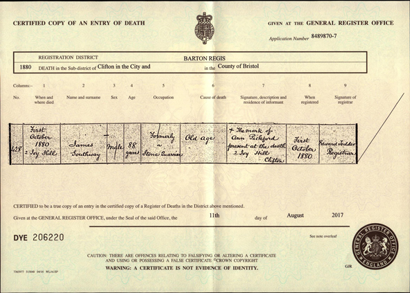 James Southway lived to the grand old age of 88. He died on 1st October 1880 at 2 Joy Hill, Clifton. His death was registered by Ann Pickford. Whether this was his daughter or other relative, is unknown at this stage.