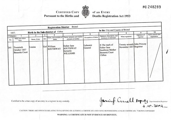 Louisa Southway was born on 20 October 1857 at Bennett’s Court in Clifton.