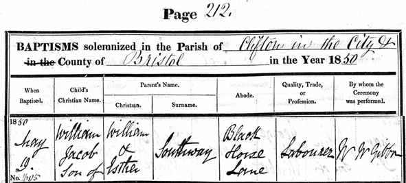 William Jacob Southway was born early in 1849 in Black Horse Lane, Clifton. He was baptised on 19th May 1849 at St Andrew, Clifton.