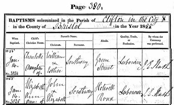 Charlotte Southway was born 1855 and baptised at St Andrew, Clifton on 14 January 1855.
