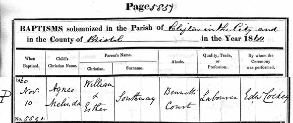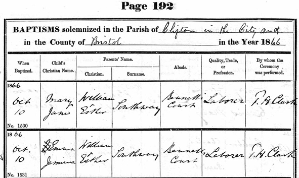 Mary Jane Southway was born in 1866 at Bennett’s Court in Clifton. She was baptised alongside her older sister, Emma Jemima, on 10th October 1866 at St Andrews in Clifton.