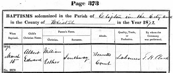Albert Edward Southway was the youngest of all ten children of William and Esther Southway. He was born in 1872 and baptised at St Andrew in Clifton on 15th March 1872.