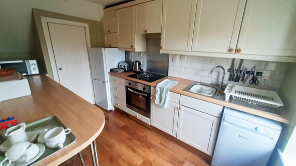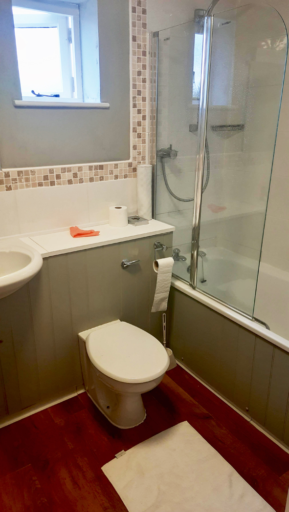 We quickly unloaded and found room for most things in the kitchen. It’s a good size fridge with freezer underneath. With temperatures dropping in the evening, we’re also storing some bottles and cans on the window ledge outside (there’s a wall so nothing can drop onto the path below!).