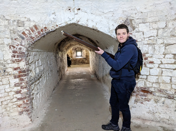 Just a little way up the road was Deal Castle – one of the finest tudor artillery castles in England. Surprisingly, slap back in the middle of town, surrounded by buildings and houses on three sides; the sea on the other. The design was similar to Walmer in shape. This one though was long past being inhabited. It was interesting down in the depths of the castle at moat level – “the rounds”. Here, the archers would defend the moat. Each bay was sectioned off from the others by a narrow tunnel circling the basement. Half was closed due to flooding, but you did get a little disoriented and certainly felt as though you’d wandered further than we had.