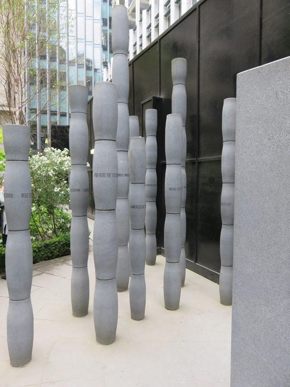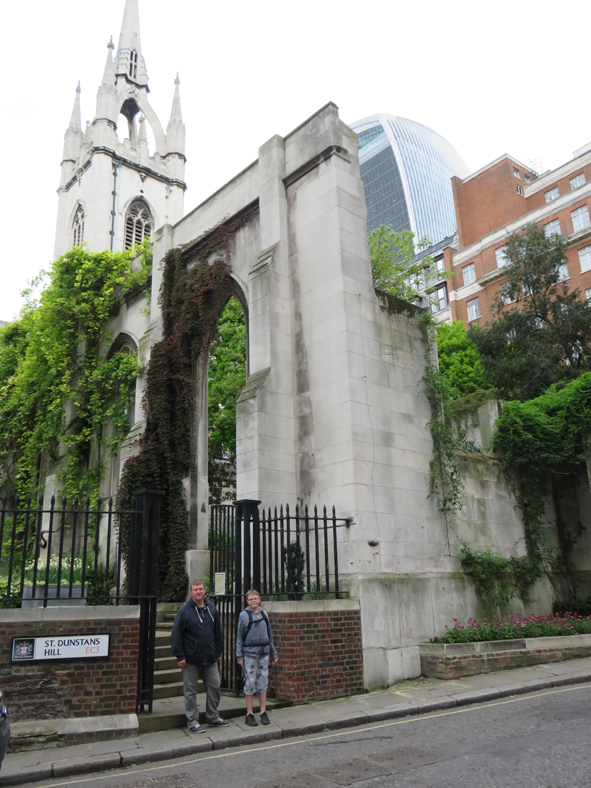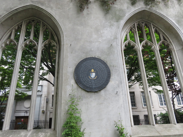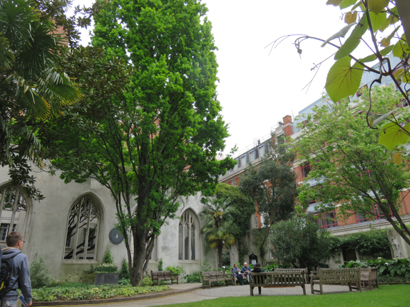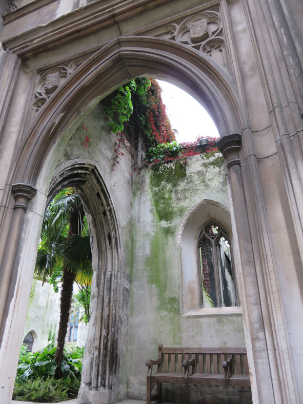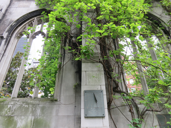 The church was severely damaged in the Blitz of 1941. Wren’s tower and steeple survived the bombs’ impact. Of the rest of the church only the north and south walls remained. In the re-organisation of the Anglican Church in London following the War it was decided not to rebuild St Dunstan’s, and in 1967 the City of London Corporation decided to turn the ruins of the church into a public garden, which opened in 1971. A lawn and trees were planted in the ruins, with a low fountain in the middle of the nave. The tower now houses the All Hallows House Foundation. This is a real tranquil niche in a the heart of one of the busiest cities in the world.