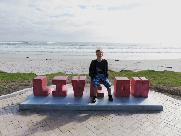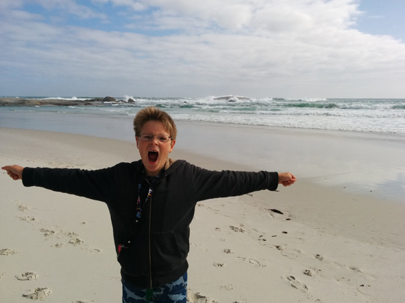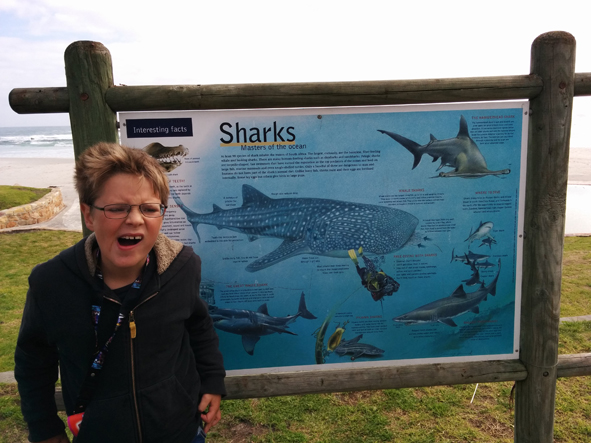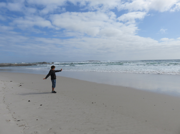 We could smell the sea and the sand looked really white. We headed towards the beach, spotting the warnings about sharks in the sea … luckily it was too cold to do anything but paddle.