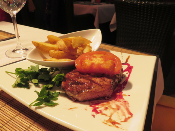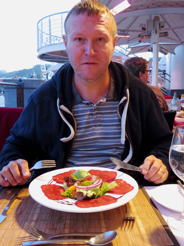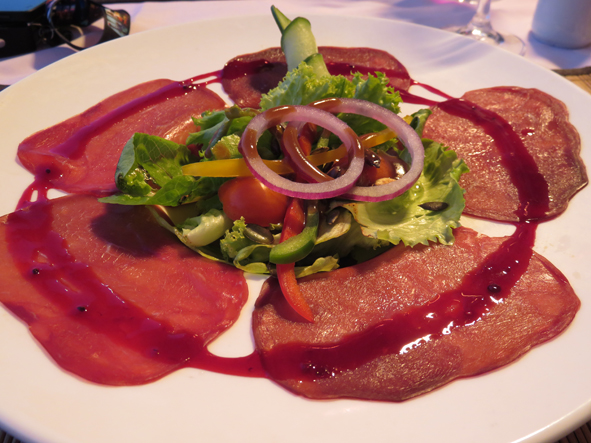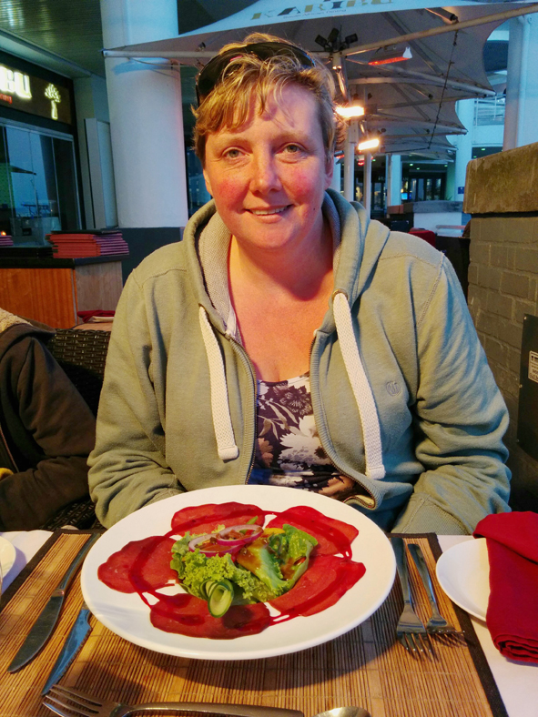 Callum was getting hungry so we decided to find somewhere to eat before heading back to the hotel. So much choice and Callum was getting a little frustrated that we kept studying the restaurant menus but didn’t stop at any! Jon remembered he’d had some fantastic springbok carpaccio at one of the restaurants – he remembered which one it was when we got there – Karibu (African for Welcome).