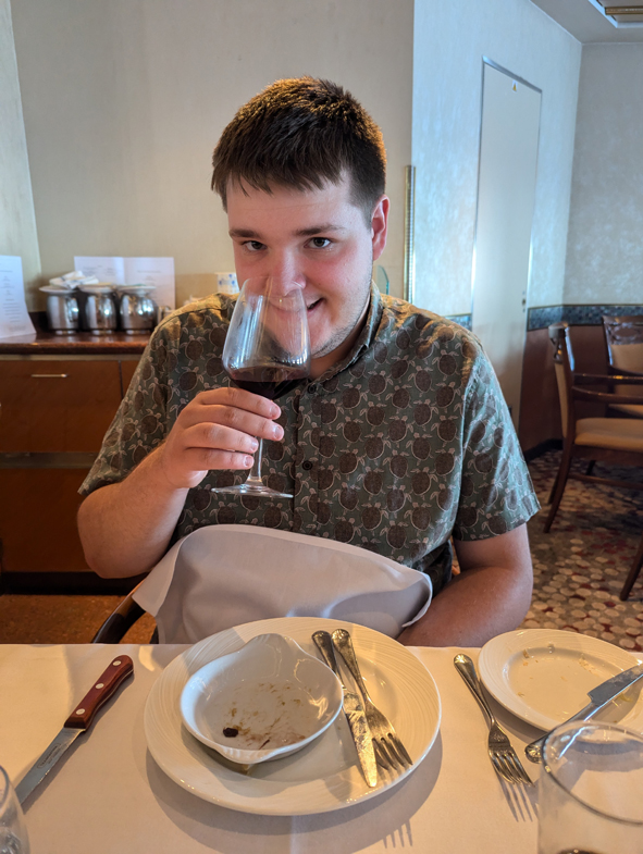 Prawn baguettes were on the luncheon menu in Medina so we headed there for lunch. The Crispy Chicken burger with Swiss Cheese and sweet chilli sauce took Callum’s fancy. We shared a table with another two couples. One of them was sharing a table at dinner with someone on the coach that had a nightmare journey. Not only had the coach broken down, the replacement bus developed a fault and could only travel at 20mph. Meanwhile, someone on the bus has fainted and an ambulance was called. Eventually she got some fresh air and was able to continue. The broken down coach was repaired and caught up with the other coach at Northampton and eventually got into Southampton a couple of hours late. As well as passengers for Aurora, there were passengers for Arvia too.
