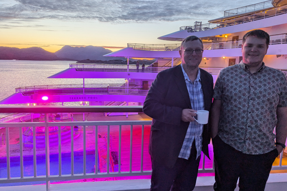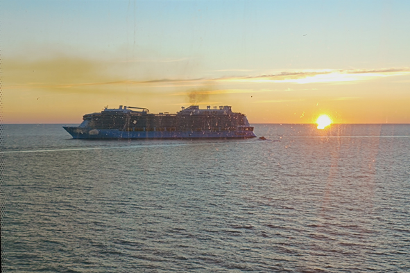 Back up to Horizon afterwards for the Syndicate Quiz hosted by Ned. The sun was setting and Aurora was starting to turn into Sognefjord. Just as the sun was about to set, a Royal Caribbean cruise ship passed in between us and the sun. We thought for a moment it would block our view of the sunset but never fear.