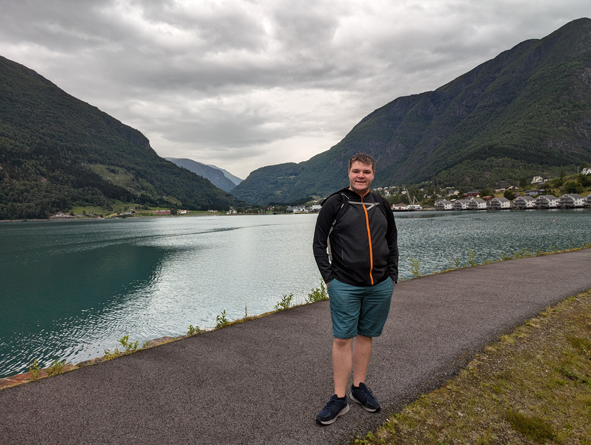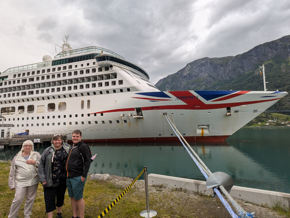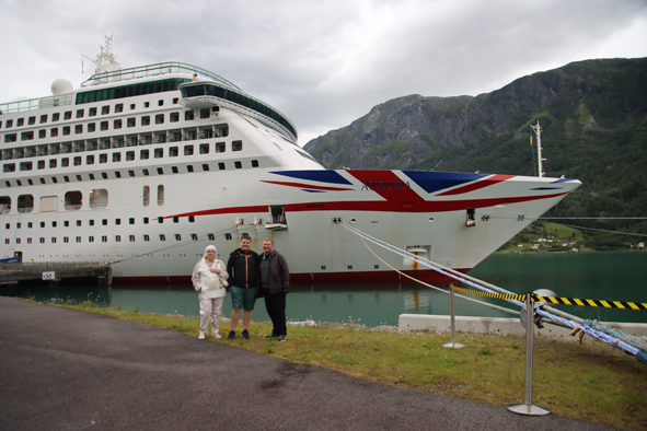 Mum started to walk back to the ship and told us to catch her up. We walked a little further around to get some photos of the ship and the fjord. We caught Mum back up and by now the rain was bouncing of the road and we were soaked.