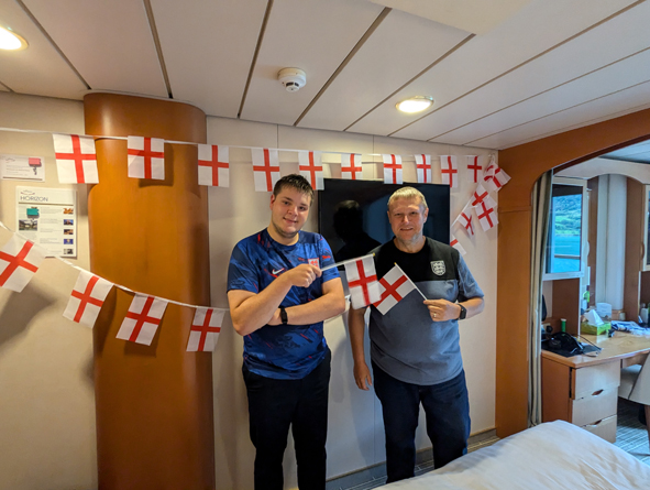 We were sailing through Sognefjord and as the ship was flanked by high mountains on either side, getting signal was a problem. A few fleeting glimpses of the team and national anthems before kick-off but technology had let the ship and passengers down. Do we head back to the cabin or do we stay in Carmen’s and keep fingers crossed the signal came back?