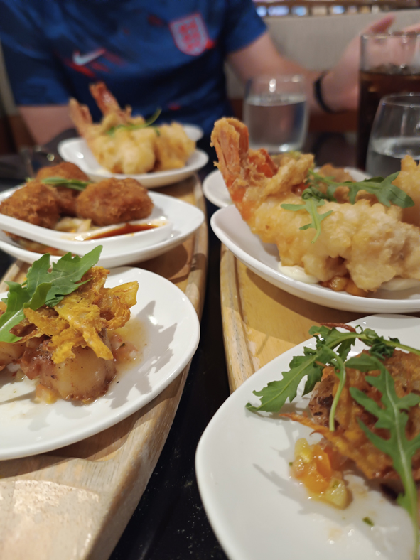 We opted for the Glass House … tasting plates of Tempura Prawns, Scallops, Oxtail Bonbons and Popcorn Chicken. This was followed by Fillet Steak with King Prawns for Jon, Karen and Audrey whilst Callum went for the Rib-Eye Steak.