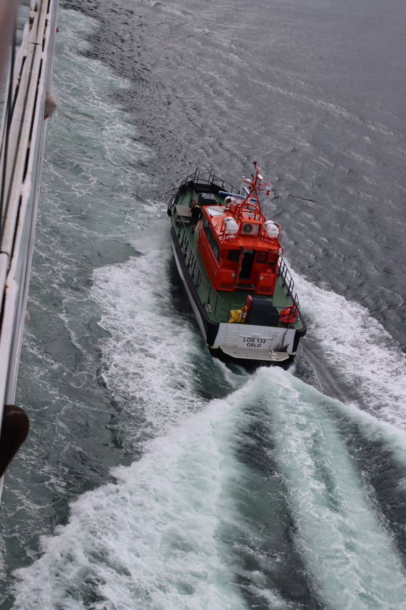 Not long after leaving, the pilot boat came alongside both ships. We kept an eye open for the Aquarium as we sail past … easily spotted as there’s a giant orange octopus stuck on the side of the building.